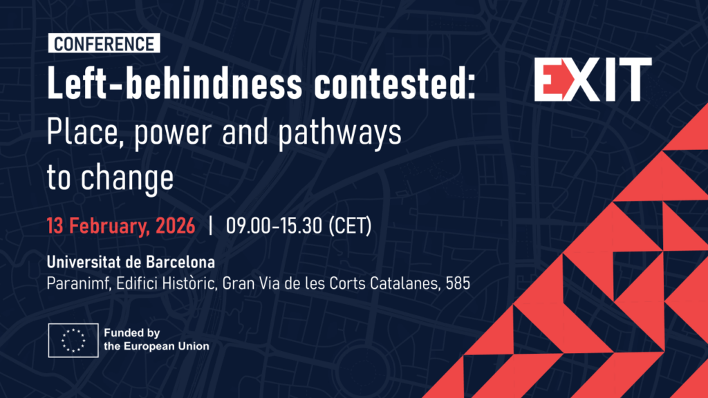 The EXIT project takes an interdisciplinary and multi-site approach, combining territorial ethnographic methodologies with advanced quantitative analysis, in order to understand socio-economic inequalities and their implications. In its first stage, EXIT analyses the concept of “left-behind” places, a term that has gained visibility in international debates on territorial inequality following phenomena such as Brexit and the election of Donald Trump in 2016. Through this concept, the project studies how discourses on territorial inequality are constructed in different national contexts and how they relate to public policies and EU funding frameworks.
